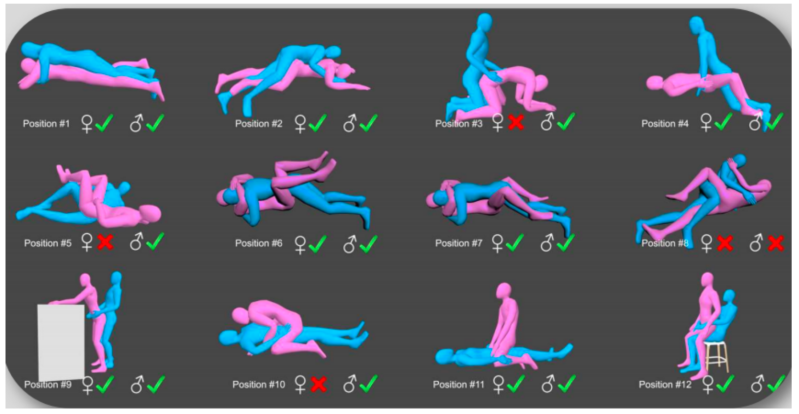 Dit zijn computer simulaties gebaseerd op MRI onderzoek om extreme standen van een kunstheup te bepalen (Caecilia Charbonnier et al: Sexual Activity After Total Hip Arthroplasty: A Motion Capture Study, 2014). Per standje is aangegeven of er wel (rood x) of geen (groen V) risico is voor uit de kom gaan van de heup (blauw mannetje, roze vrouwtje). U kunt dus veilige standjes uitzoeken.